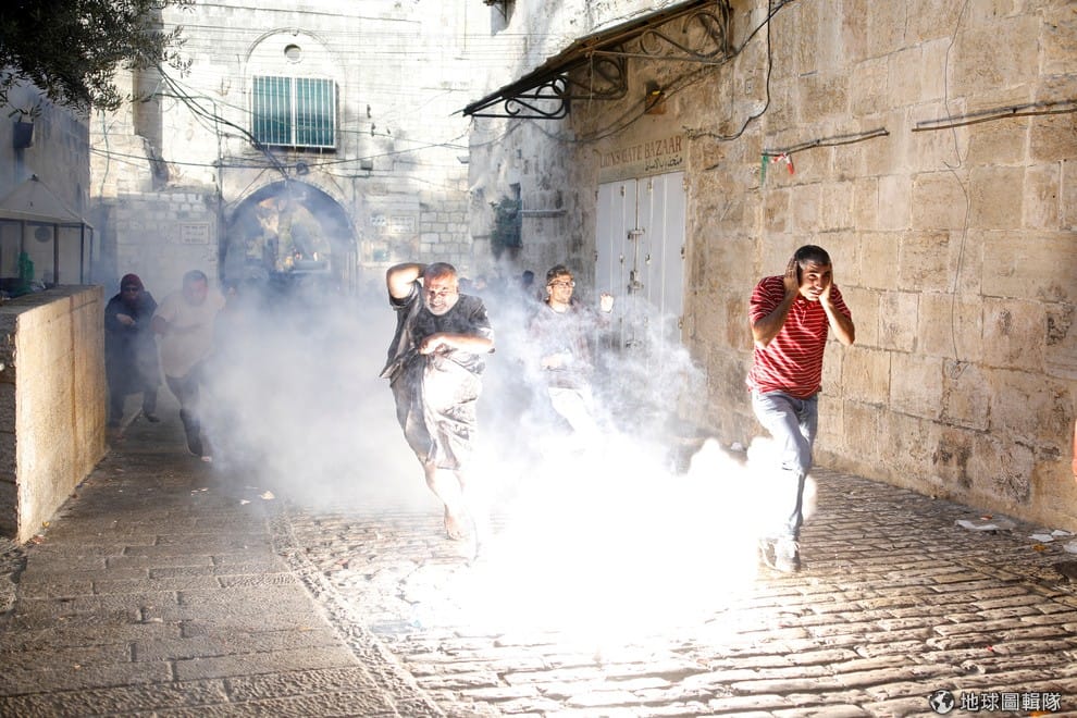 以色列鎮暴警察為了驅離徘徊在阿克薩清真寺(al-Aqsa mosque)周邊的巴勒斯坦人,對著他們拋出會讓人頭暈目眩的閃光彈,讓在場民眾抱頭鼠竄。