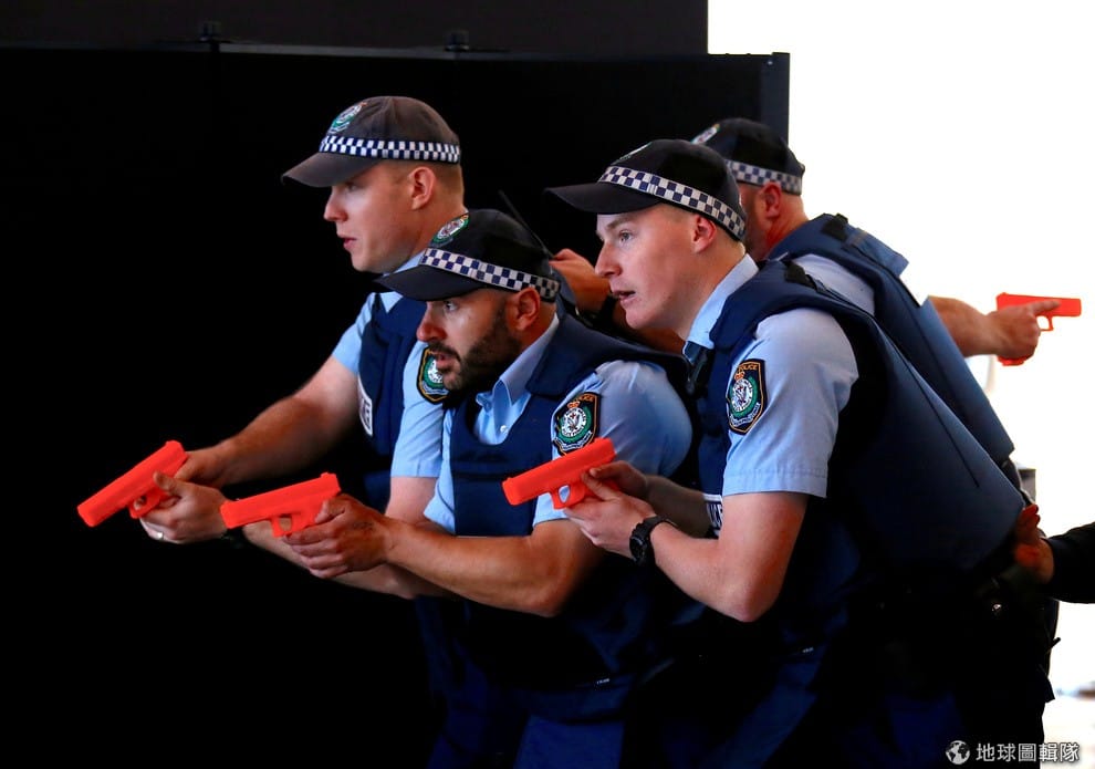 在雪梨港的國際客運碼頭,澳洲警察手拿紅色的模型槍模擬遇到武裝歹徒該怎麼辦。