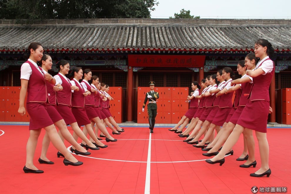 在中國人民解放軍成立 90周年紀念前夕,國家火車服務員在造訪國旗護衛隊時接受了愛國教育,她們也身體力行地練了如何整齊劃一踢正步。