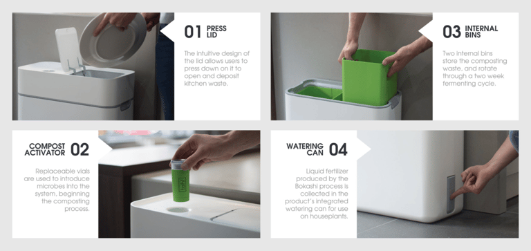 有別於一般堆肥會使用蟲、加熱、手動旋轉來執行堆肥,華生是從日本傳統的「發酵」(bokashi)堆肥取得靈感。在日本,人們會在廚餘裡混合大批米糠,並把桶子密封 10-12天後製成堆肥。