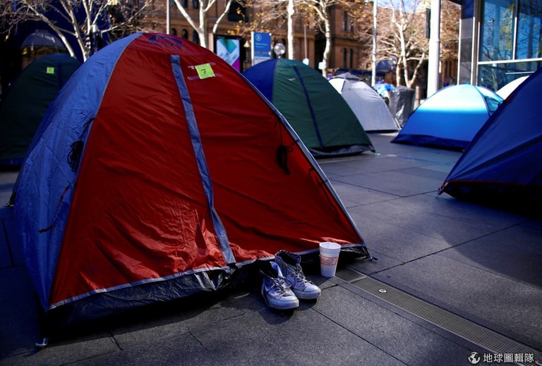 在澳洲新南威爾斯州的雪梨市中心,馬丁廣場(Martin Place)堪稱心臟地帶,四周充滿閃閃發光的高級建築和精品店,澳洲儲備銀行、聯邦銀行、雪梨郵政總局和澳洲七號新聞電視台都在這,不過從去年 12月開始,這裡出現了一座座五顏六色的帳篷,吸引無家可歸的民眾紛紛進駐,也引起新南威爾斯州州長和雪梨市長的隔空交火。