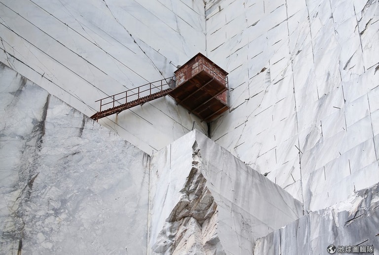 現在採石場的超現實景致恐怕連米開朗基羅都難以想像了。因為開採的緣故,採石場看起來就像倒過來的樓梯,懸掛在岩壁上的工人則像在上頭行走。當你被一塊塊純白的大理石籠罩時,也會有著身處天堂的錯覺。
