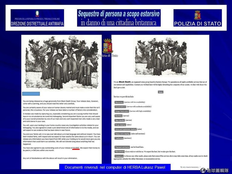 而綁架艾琳的綁匪自稱屬於網路犯罪團體「黑色死亡」(Black Death)的一員,他們原本打算以 30萬美元(折台幣約 912萬元)的代價,要求艾琳的模特爾經紀公司來贖艾琳,否則就要把她賣給他人當性奴。