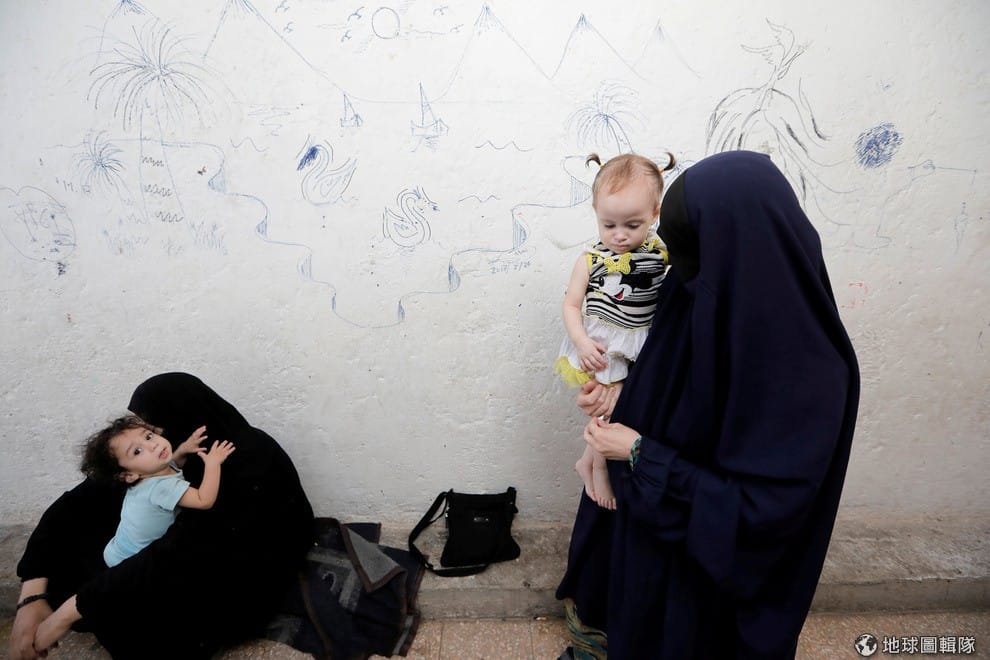 在收容難民的敘利亞拉卡城(Raqqa)北部,來自車臣的查札理瑪(Zarima,右)正在照顧她的孩子,她是一名前伊斯蘭國(IS)聖戰士的妻子。