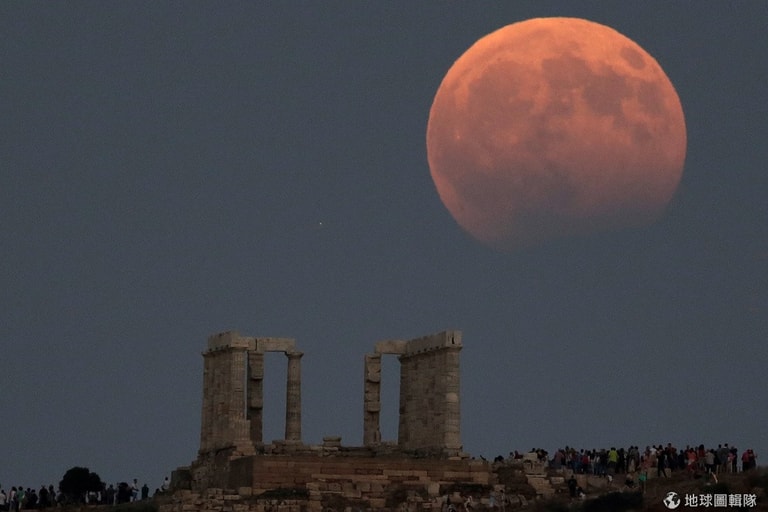 本月 7號出現了難得一見的月偏食現象。在雅典東部的波塞頓神殿,一小部分被遮住的滿月大大地掛在天空中。