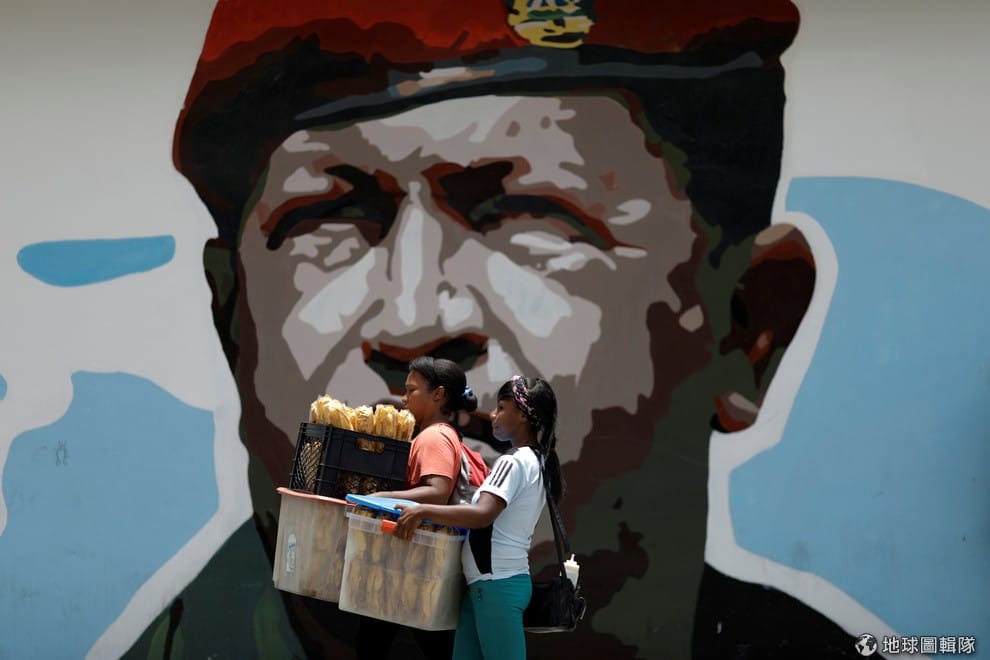 在委內瑞拉首都卡拉卡斯(Caracas),兩名女子走過了委國前總統查維茲(Hugo Chavez)的畫像。