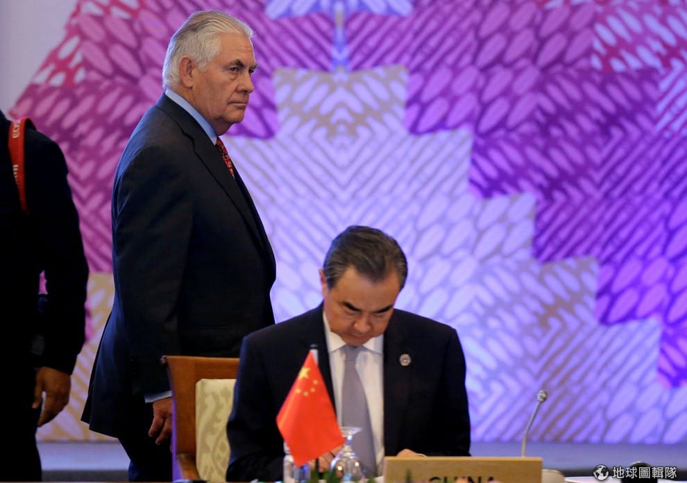 美國國務卿提勒森(Rex Tillerson)經過中國外交部長王毅準備入座,他們即將進行第 7屆東南亞外交部長高峰會,這是第 50屆東南亞國協區域論壇(ASEAN Regional Forum)的其中一個環節。