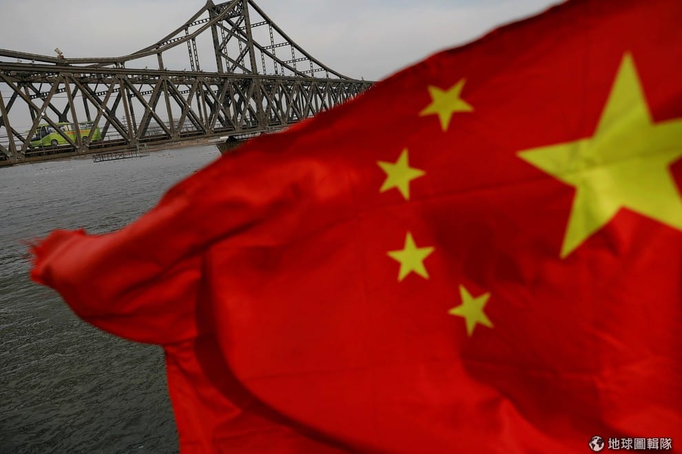 一面中國國旗飄揚在中朝友誼大橋前,這座全長大約 946公尺的橋位於鴨綠江上,連接中國遼寧省丹東市和北韓平安北道新義州市。