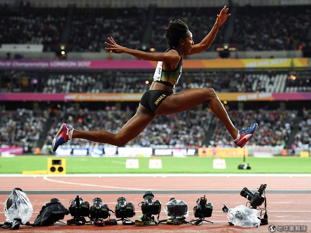 英國倫敦正在進行世界田徑賽,一名來自牙買加的選手在女子三級跳遠比賽奮力一跳,努力要拿下好成績,攝影師也在賽道上擺好相機,想要拍下最亮眼的瞬間。