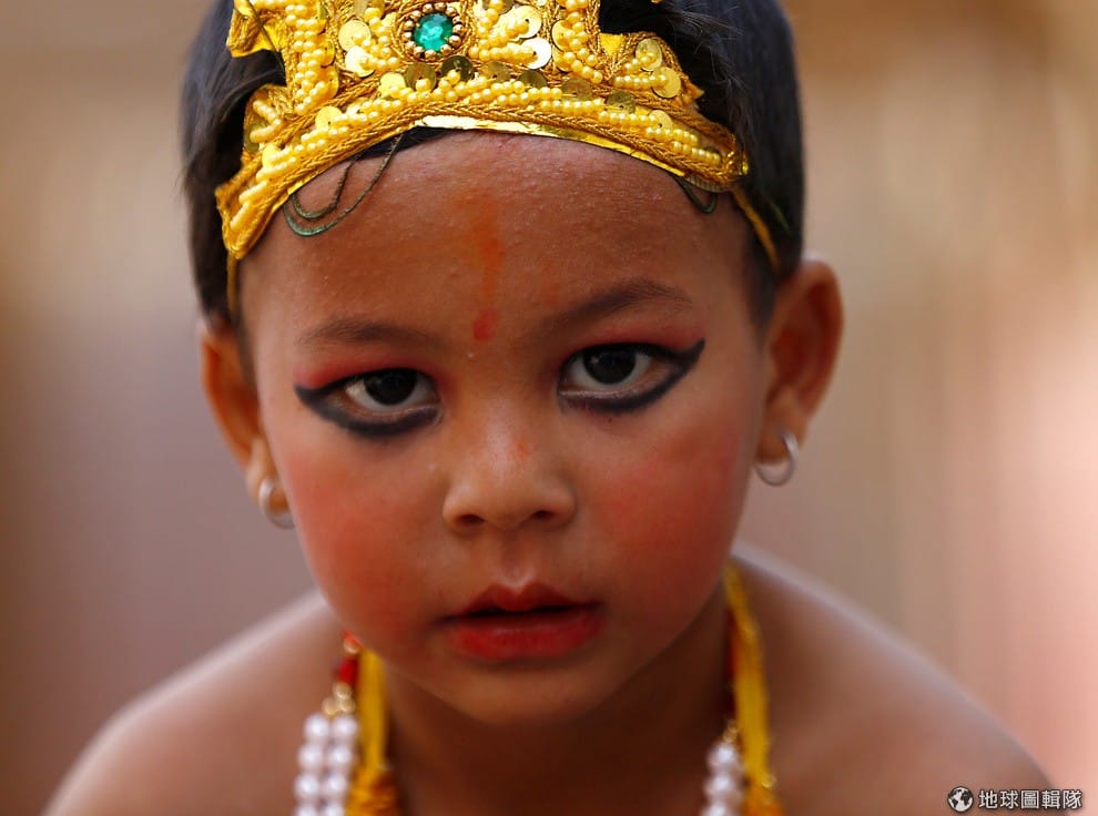 一名小男孩打扮成毗濕奴神的化身黑天神(Lord Krishna)的模樣,準備參加蓋加特拉節(Gai Jatra,也稱神牛節)的遊行。在慶典這天,信徒會為他們離世的親人尋求救贖與和平,牛則是扮演了幫助這些靈魂前往天堂的引渡者。
