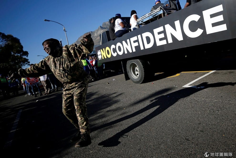 示威民眾在南非首都開普敦(Cape Town)遊行,不滿南非總統祖瑪(Jacob Zuma)沒有通過不信任投票。