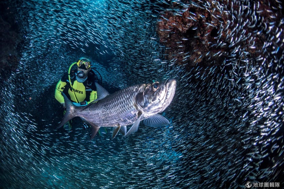 在大開曼島(Devil's Grotto),一名潛水員被成群的溪銀漢魚環繞,攝影師也把這奇特的瞬間捕捉下來。根據研究者表示,每年只有幾周的時間,開曼群島的洞穴才會出現這種魚群環繞的景致。