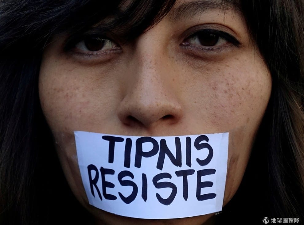 一名示威分子在嘴上貼上「對抗Tipnis」的牌子,不滿政府在最近針對伊西博羅原住民保護地國家公園(Isiboro Secure National Park and Indigenous Territory, TIPNIS),提出了年度保護法案。