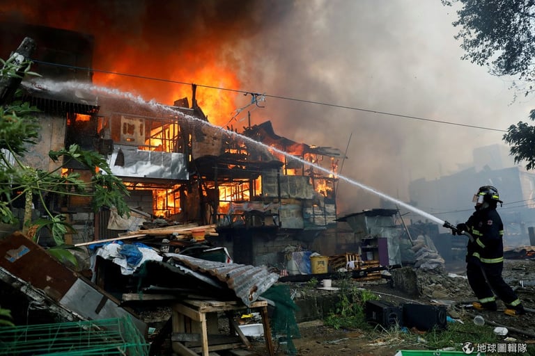 菲律賓首都馬尼拉(Manila)奎松市的住宅區在 11號發生大火,消防人員正趕忙控制住宅內的火勢。
