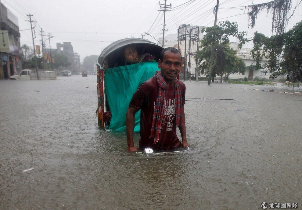 特里普拉邦首府為阿加爾塔拉(Agartala)在這幾天發生大雨,雖然街道上的水已經淹到人的半身高,一名三輪車伕不畏大雨,依舊在大水中騎著他的三輪車載客。
