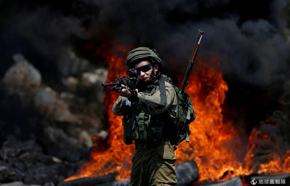 在約旦河西岸的村落,一名以色列軍人把槍瞄準了眼前的巴勒斯坦示威者。