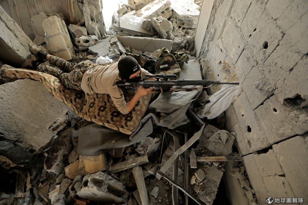 在拉卡城(Raqqa),一名敘利亞民住自由軍(Syrian Democratic Forces, SDF)的狙擊手瞄準好眼前的伊斯蘭國(IS)戰士,隨時準備扣下扳機。