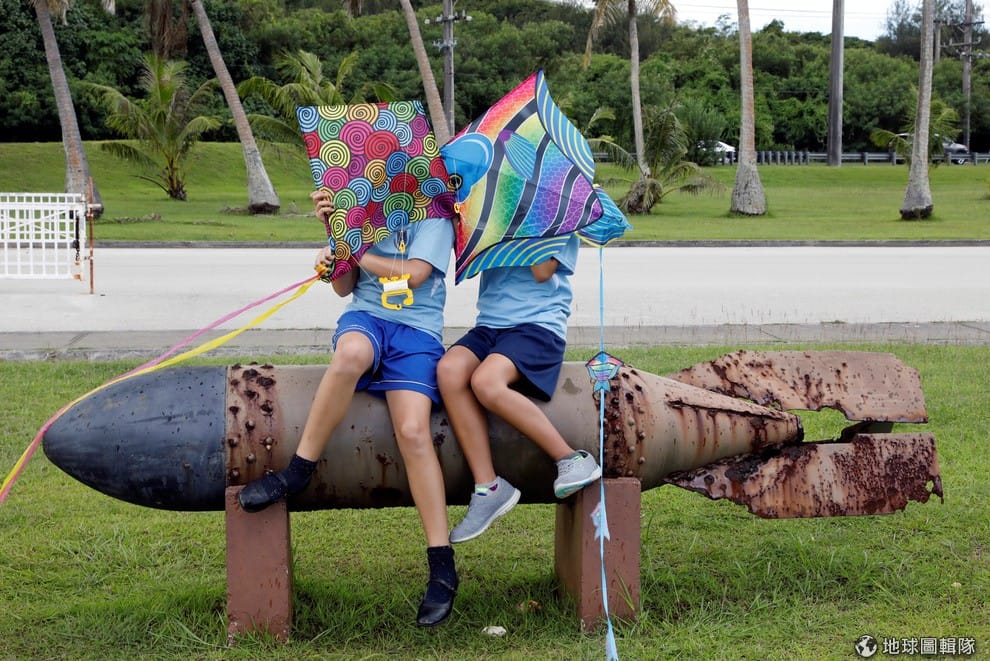 在美國關島的太平洋戰爭紀念公園,兩名小學生坐在二戰時期留下來的炸彈彈殼上玩耍。最近北韓與美國持續在國際上針鋒相對,本月 10號,北韓更放話要對關島進行武力包圍,消息傳出後美國、南韓、日本都強調他們絕對不會懈怠。