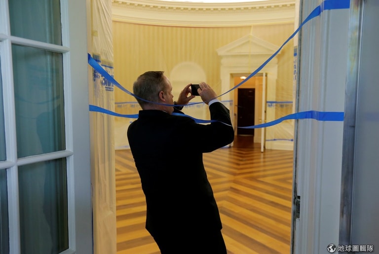 前白宮發言人史派瑟(Sean Spicer)隔著帶子把白宮空空如也的橢圓形辦公室拍了下來。橢圓形辦公室是美國總統的正式辦公室,這裡最近在重新裝修,所以辦公室內的家具、地毯、其他裝飾品全都被搬了出來。