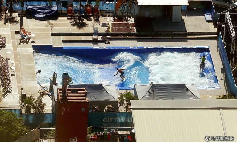 在蘇黎世的一座游泳池,一名男子利用泳池的人造海浪一解衝浪癮。