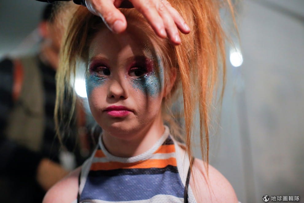 2017年 2月,一名有唐氏症的澳洲服裝設計師史都華(Madeline Stuart)在後台打扮好,準備跟模特兒一同登台。