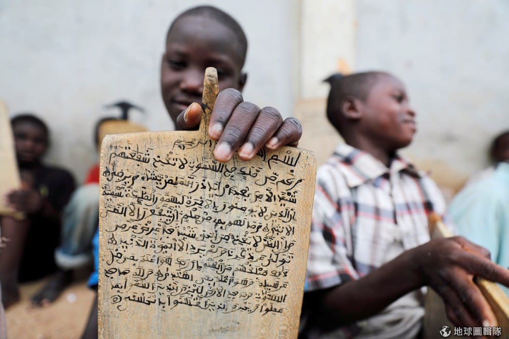 一名男孩向鏡頭展現刻有可蘭經的石板,他和其他小朋友一起在西北部卡諾市(Kano)的一所可蘭經學校中學習。