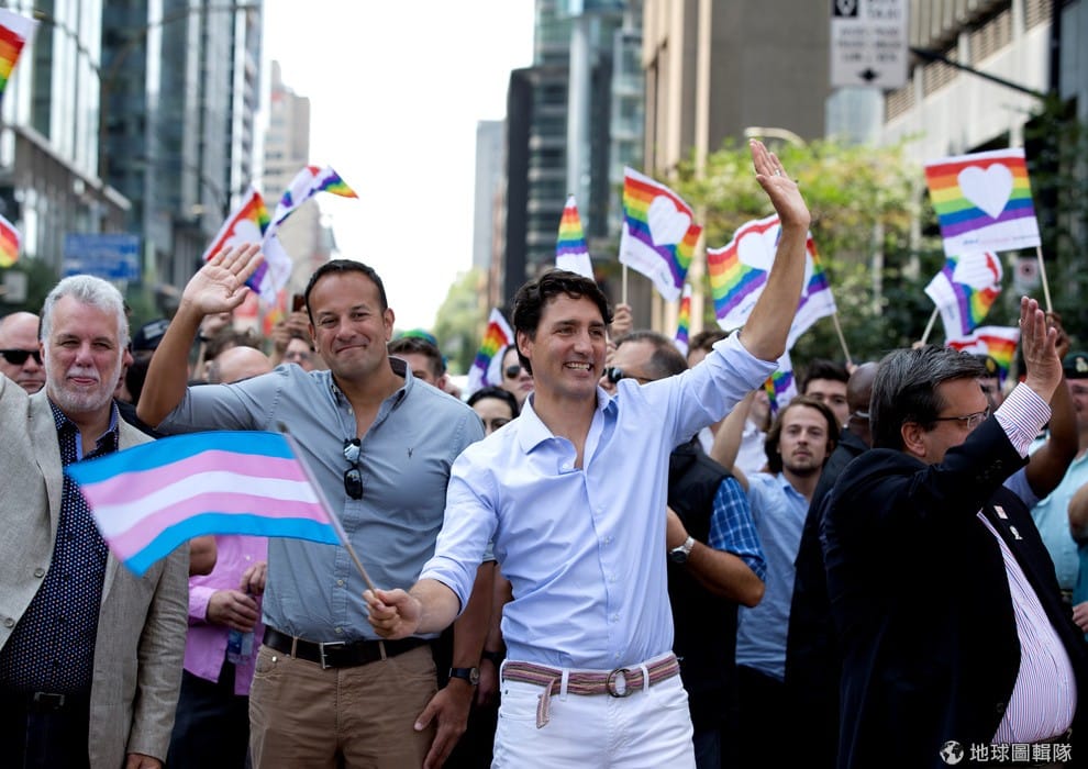 20號這天,加拿大總理杜魯道(Justin Trudeau, 右二)和愛爾蘭總理瓦拉德卡(Leo Varadkar, 左二)一起參加蒙特婁同志大遊行。