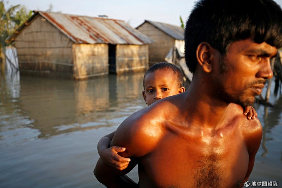 在大水肆虐的北部博格拉市(Bogra),一名小男孩趴在爸爸的背上準備到安全的地方避難。