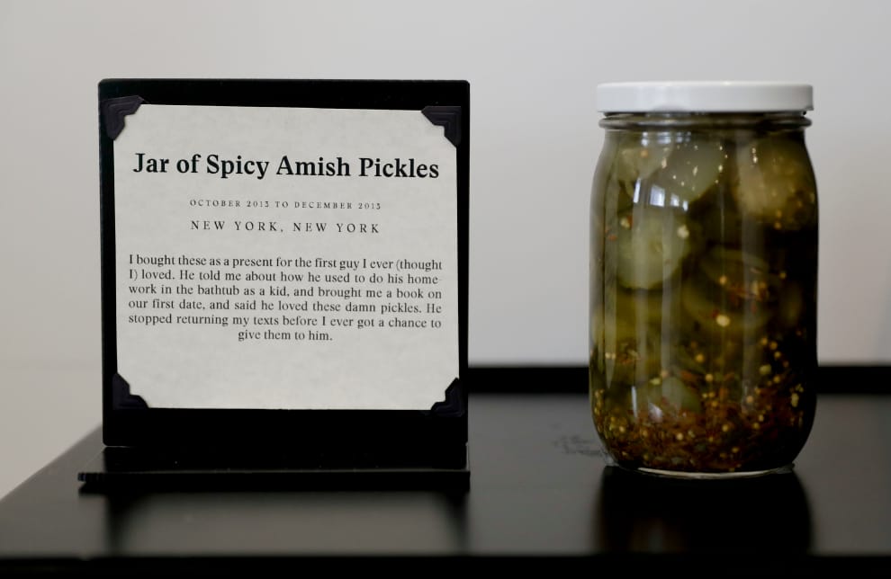在美國加州洛杉磯的分手博物館內,可以看到一罐醃黃瓜。有些人會為他們的捐贈品寫上幾句簡短的介紹,有些人則會寫上數百字的自述。基於匿名原則,博物館的介紹卡上往往只會標註捐贈者的姓氏,或甚至什麼都不標。
