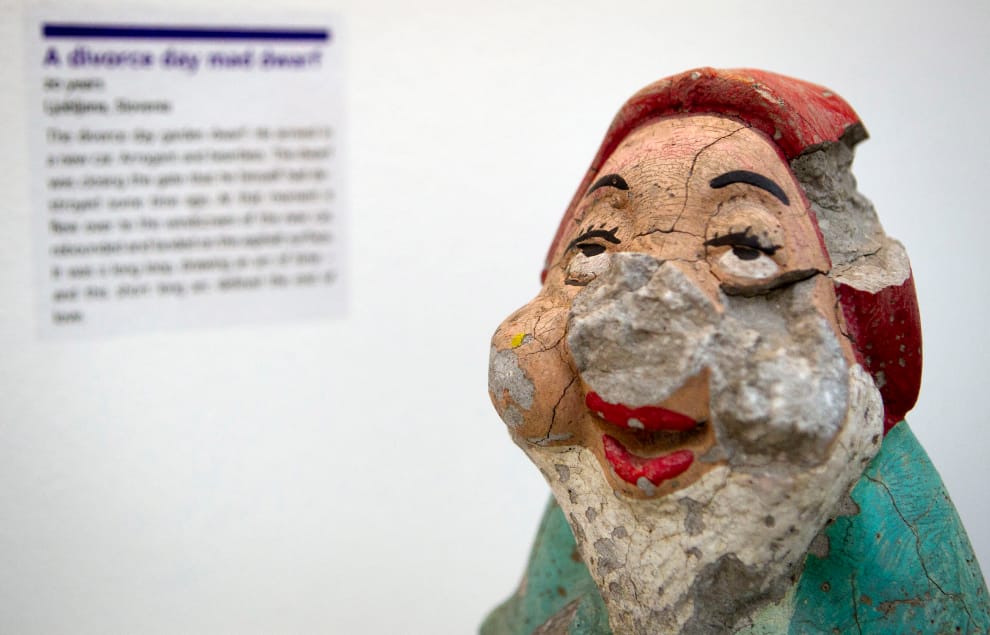 在克羅埃西亞首都札格雷布的分手博物館,裡頭展示著各式各樣奇妙的展品,每一樣展品背後都有一段心碎的故事。圖為一尊遭到破壞的花園地精雕塑。