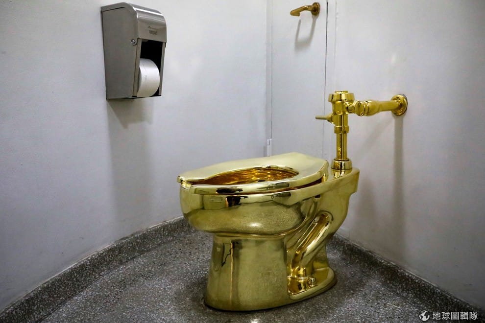 在紐約古根漢美術館(The Guggenheim Museum)內,一座金馬桶熠熠生輝,這是義大利反骨裝置藝術家卡特蘭(Maurizio Cattelan)的作品〈美國〉(America)。