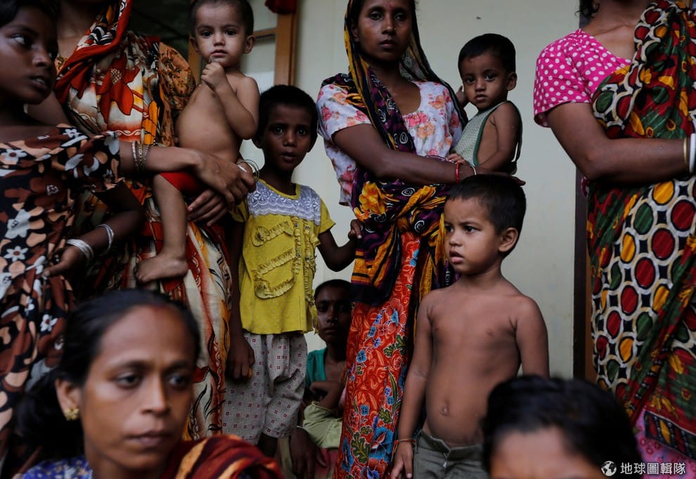 在西部若開邦的孟都(Maungdaw),一群遭到迫害的洛興雅(Rohingya people)女子抱著孩子逃離家園,來到這裡的臨時收容所暫居。