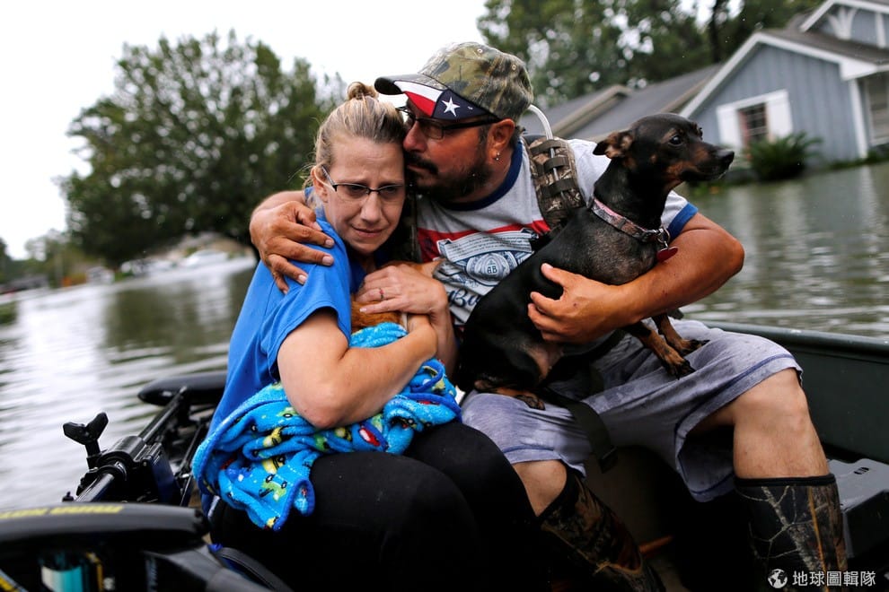 在受到哈維(Harvey)颶風重創的德州,災民岡札雷斯(David Gonzalez)一手抱著愛犬,另一手擁著妻子凱西(Kathy Gonzalez),準備撤離被淹成一片汪洋的家園,到安全的地方避難。