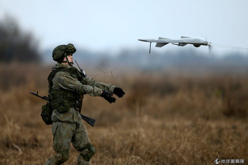 路透社一名俄國軍人在訓練中使用無人機。俄國總統普亭認為,未來戰爭獲勝的關鍵在無人機的作戰能力。