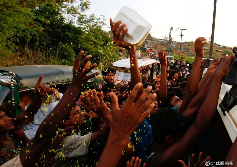 在孟加拉科克斯巴扎爾縣(Cox's Bazar)臨時搭建的難民營內,洛興雅(Rohingya)難民伸手想要搶先取得食物。