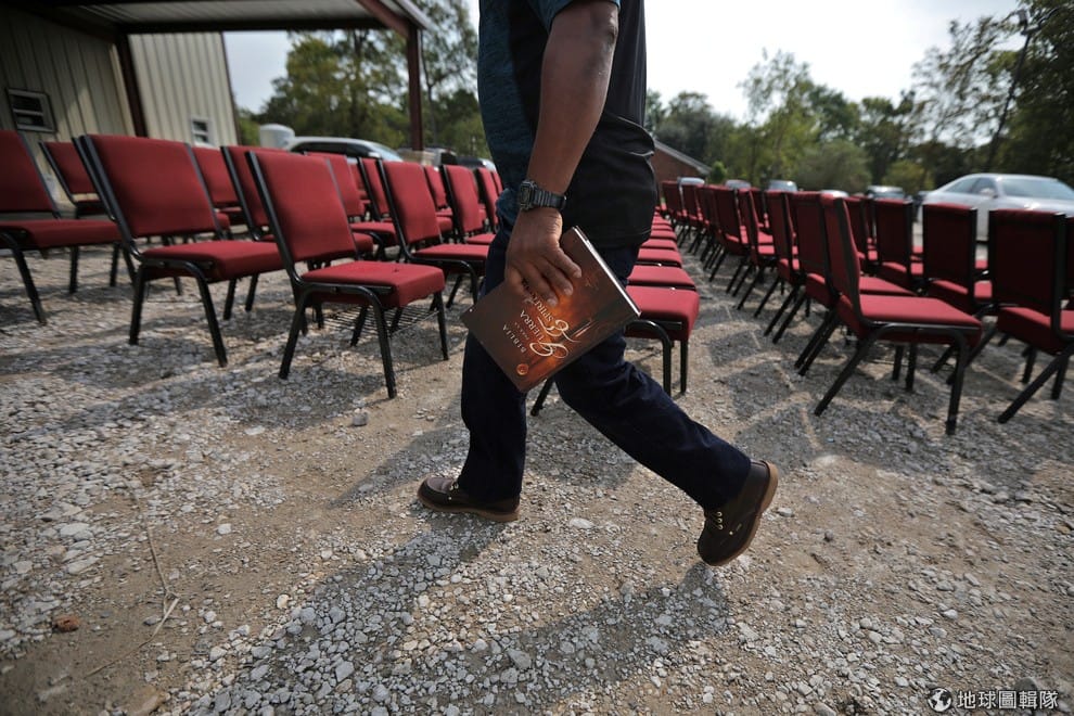 在颶風哈維(Harvey)離開後,人們在上周日(3)迎來了久違的禮拜日,一名居民走過了被擺在教堂外晾乾的椅子等著禮拜開始。