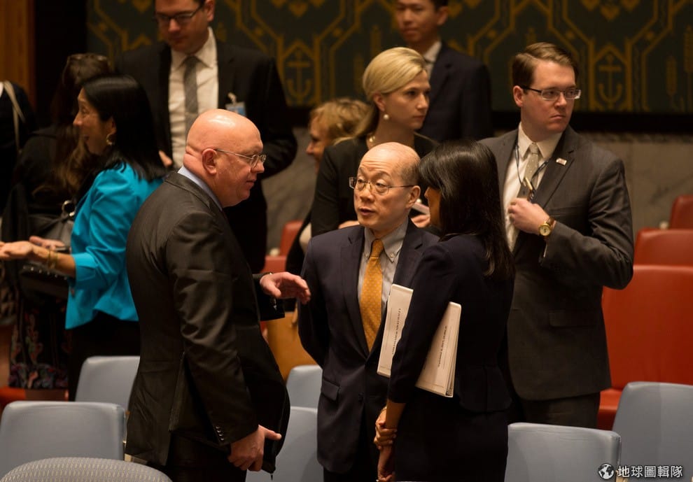 在聯合國紐約總部,俄羅斯駐聯合國大使納班濟亞(Vassily Nebenzia,左)正在和中國外交官劉結一(畫面中間)、美國駐聯合國大使海利(Nikki Haley,右)談話,他們剛針對北韓發射氫彈一事開完會。
