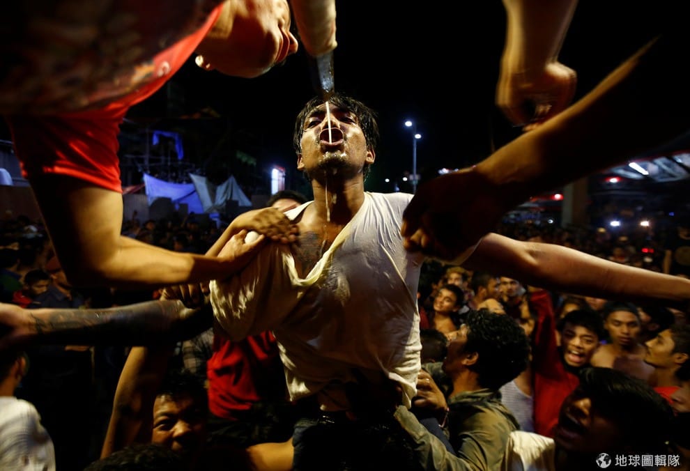 年輕人搶著要喝從名為Sweaita Bhairab的神像口中流出的自製酒,這天是當地年度慶典「因陀羅節」(Indra Jatra festival),尼泊爾居民會一同唱歌跳舞,藉此慶祝雨季結束。