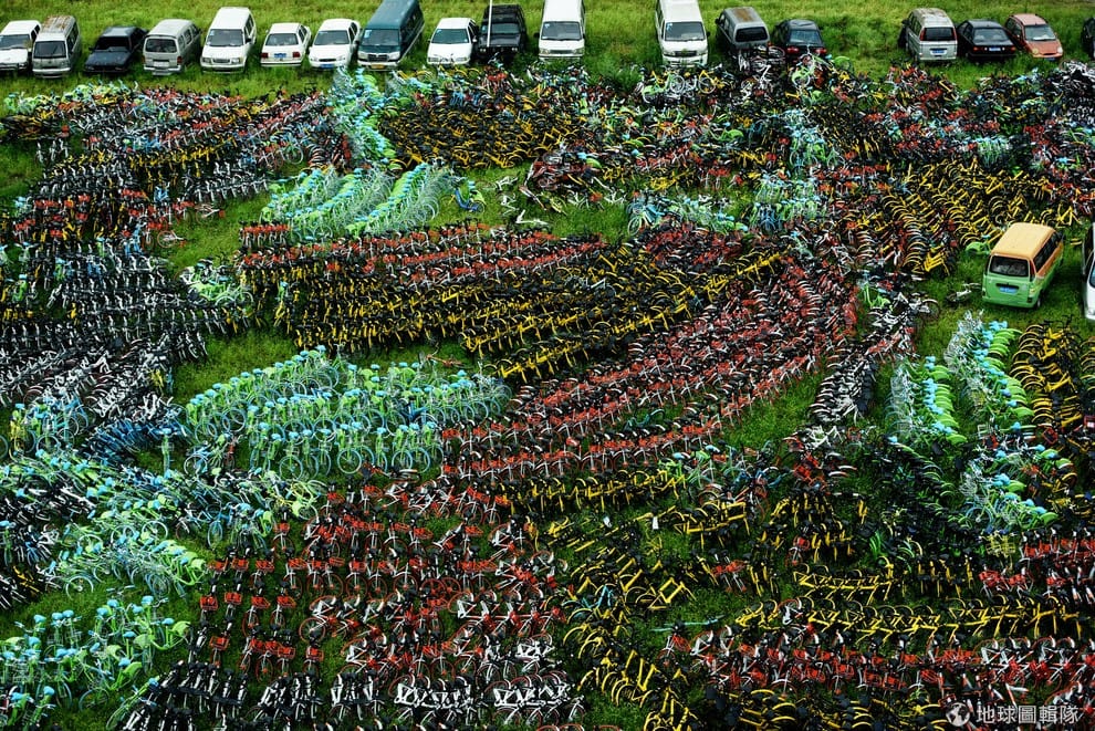 在杭州市,各式各樣的共享腳踏車被擺在停車場內,顯見不同共享公司間的激烈競爭。