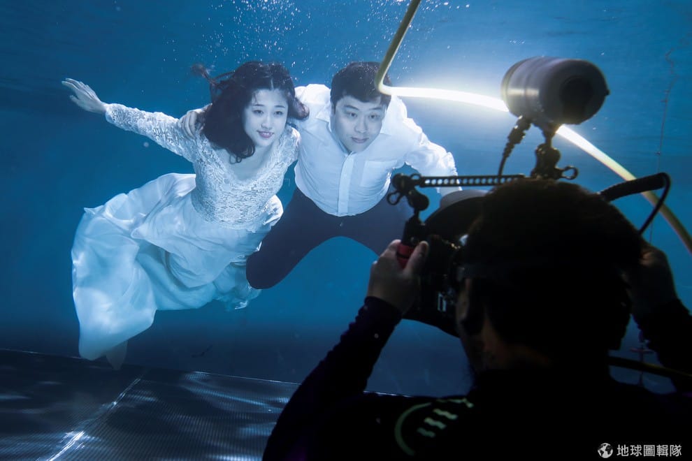 一家北京的水下攝影工作室正在替新人曹麗(右,音譯Cao Ri)和許家謙(左,音譯Xu Jiaqian)拍攝婚紗照。