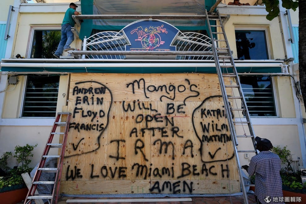面對來勢洶洶的颶風伊瑪(Irma),一家位在邁阿密海灘的餐廳替窗戶裝上膠合板以防萬一,板子上則寫著:「在伊瑪走後,我們會在周一繼續營業,我們愛邁阿密海灘,阿門。」