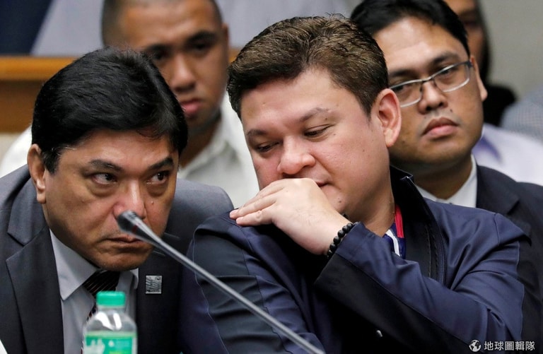 菲律賓總統杜特蒂(Rodrigo Duterte)的長子保羅(Paolo Duterte,右)正在與他的律師交談。現在是納卯市(Davao City)副市長的保羅與杜特蒂的女婿卡皮奧(Manases Carpio)因為涉嫌收賄運毒,因此被要求出席參議院的聽證會。