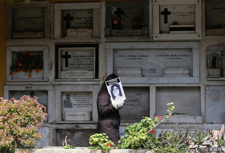 在首都聖地亞哥(Santiago)的墓園裡,一名女子舉著失蹤親友的照片,她的親友在智利軍事獨裁者皮諾契特(Augusto Pinochet)當政時失蹤。1973年,皮諾契特在美國的支持下發動流血政變,指揮軍隊包圍總統府,趕走了左翼社會主義總統阿葉德(Salvador Allende)後主政,統治智利長達 16年,期間大力鎮壓異議分子,造成上萬人失蹤和流亡海外。