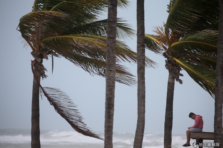 在受到伊瑪(Irma)颶風影響的佛羅里達州,一名男子頂著強風而坐,他身旁的棕梠樹被吹地呼呼作響。