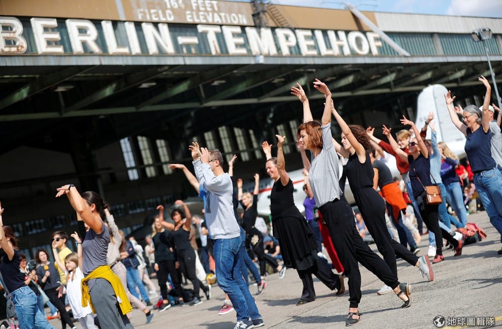 在已經退休的柏林滕珀爾霍夫機場(Tempelhof airport)前,參與「人民劇院」(Volksbuehne theatre)狂舞節(Fous de danse)的民眾投入地跳舞。