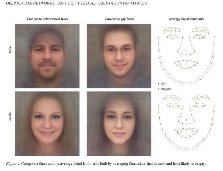 在其中一項實驗中,研究人員拿兩張照片供演算法辨識,最後發現演算法可以辨識出誰是男同志,且成功率高達 81%。在女性方面,成功率則是 71%。研究人員表示:「同志的臉往往長得和性別典型相反,男同志的下巴較窄,且鼻子較長,女同志的下巴則比較大。」