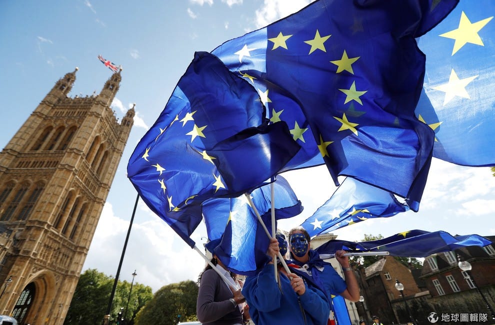 在倫敦國會大廈外,支持歐盟的反脫歐人士揮舞著歐盟旗幟,表達自己反對英國脫歐的主張。