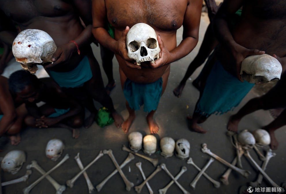 來自坦米爾納德邦(Tamil Nadu)的農夫手上捧著自殺農夫的頭骨,要求修改政府的農作保險政策,讓他們在遭遇旱災時還能活下去。