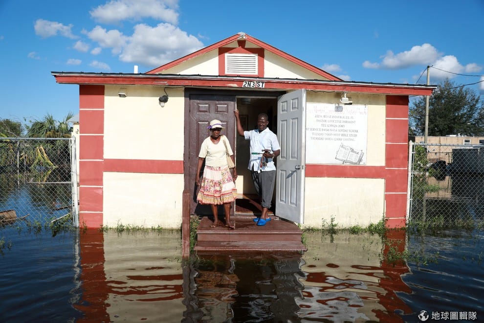 在伊瑪(Irma)颶風肆虐過後的佛羅里達州,牧師朵山(Louicesse Dorsaint)夫婦站在他們泡水的教堂台階上束手無策。