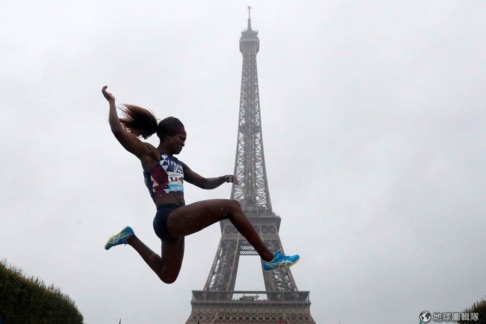 法國田徑好手吉穆(Antoinette Nana Djimou)在巴黎艾菲爾鐵塔前縱身一跳,攝影師趕緊用鏡頭捕捉下這一刻。
